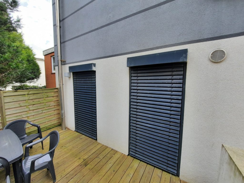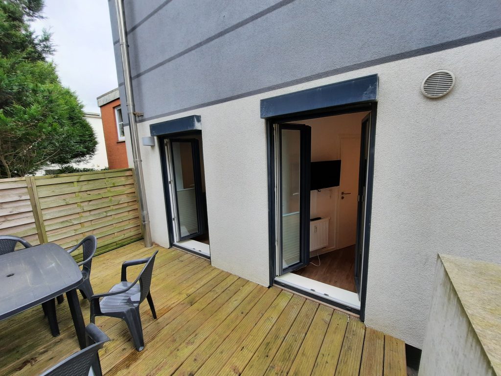 Die uneinsichtige und allein zur Wohnung gehörende Terrasse verfügt über einen Tisch mit vier Stühlen sowie zwei Deckchairs jeweils aus Teakholz und mit Auflage.