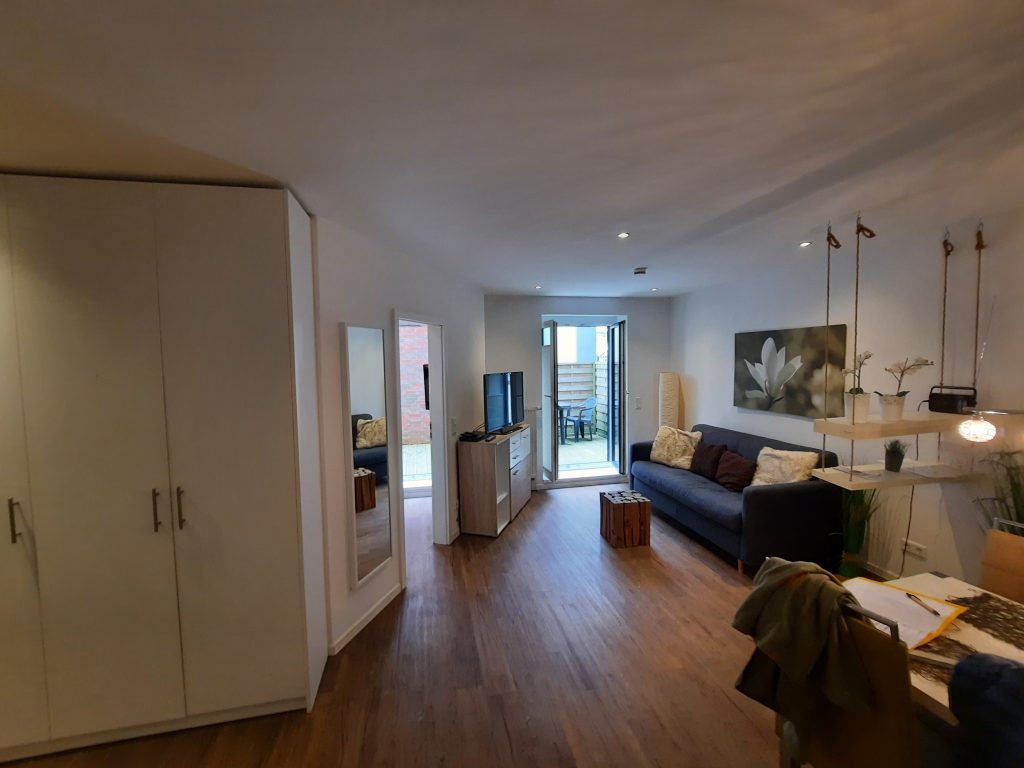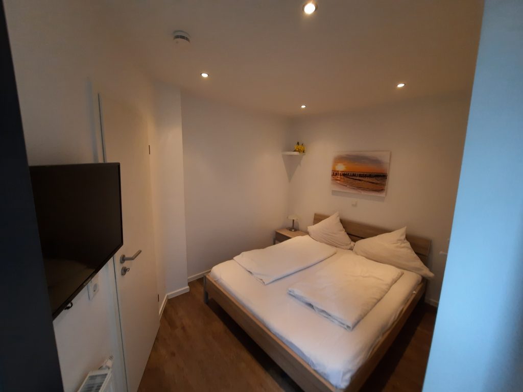 Das Schlafzimmer verfügt über ein Boxspringbrett in der Größe 1,60 m x 2,00 m und zwei Kleiderschränken. Vom Bett aus kann man bequem den Flachbild-TV an der gegenüberliegenden Wand nutzen. Das bodentiefe Fenster lässt sich komplett öffnen und führt zur Terrasse.
